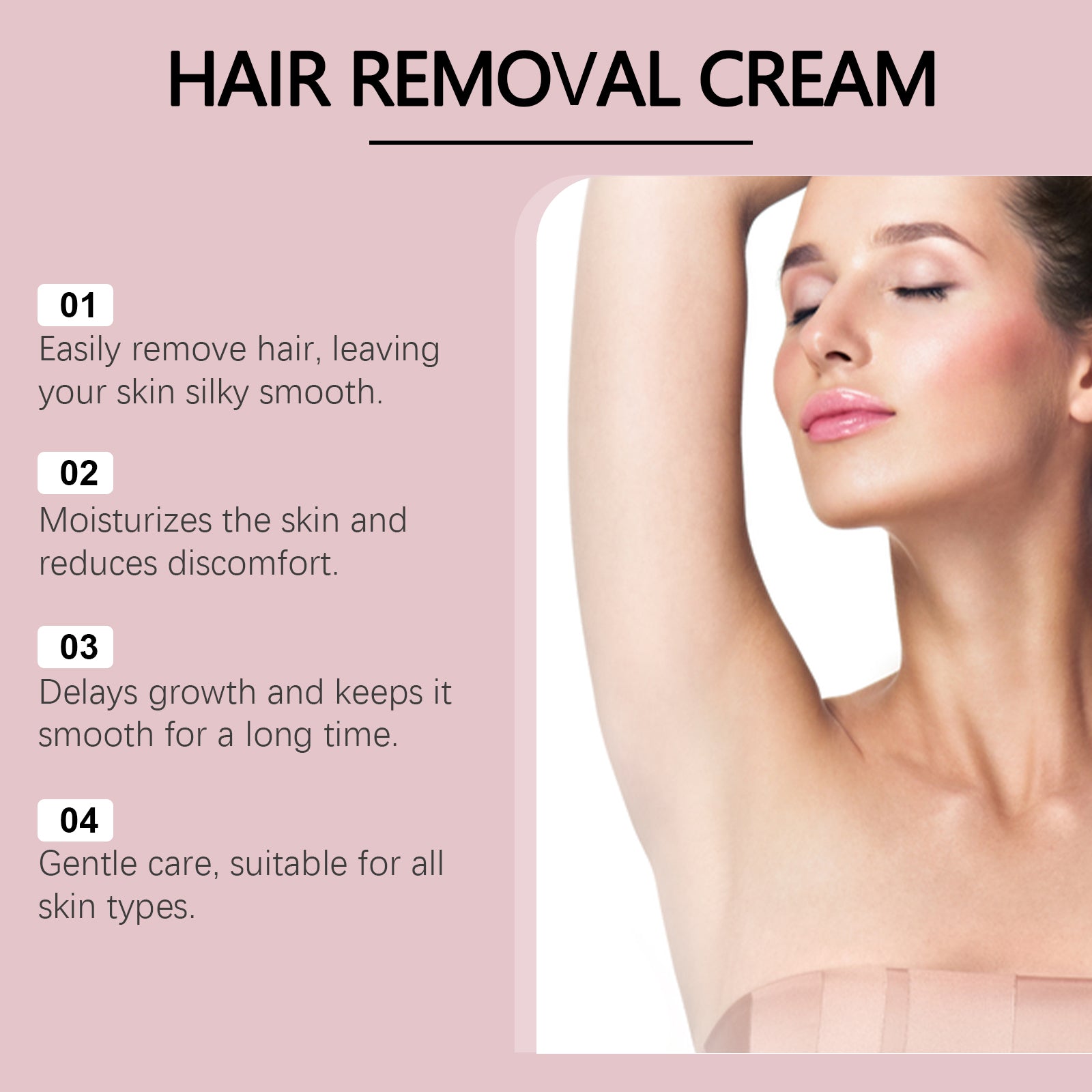 Our nourishing hair removal cream is carefully blended with glycerin, stearOL-21 and mineral grease. Designed for skin care, it won't feel tight after use and is suitable for daily care needs. Easy to use: clean your skin and keep it dry. Apply an appropriate amount of this product evenly to the skin in need of hair removal and leave it on for 5-10 minutes. Use a spatula to scrape off the hair against the direction of growth, then rinse with water. And can be easy to use, can be completed in a short time to remove hair, saving time, energy and efficiency. The formula is gentle and safe for sensitive skin, avoiding irritation and discomfort.